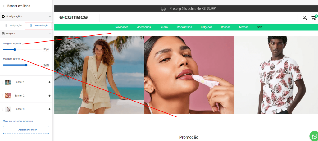 Ao acessar a aba Personalização, para essa seção você tem a liberdade de adicionar uma margem Superior ou inferior. Talvez em alguma posição da sua loja será útil essa funcionalidade.